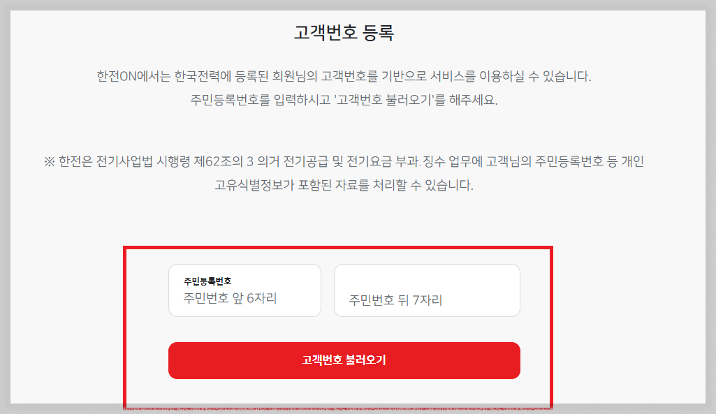 4) 주민등록번호를 작성하고 고객번호 불러오기를 클릭합니다.