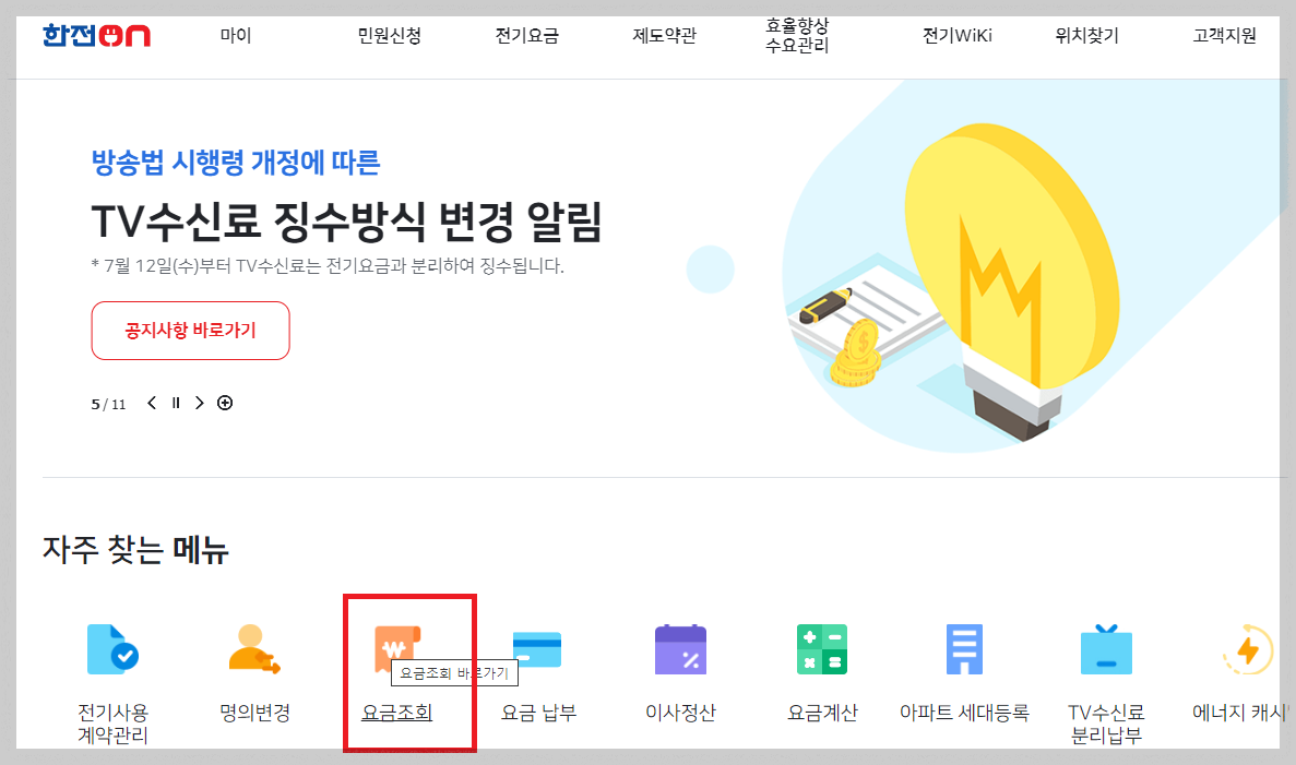 1) 한전 홈페이지에 접속하여 요금조회를 눌러줍니다.